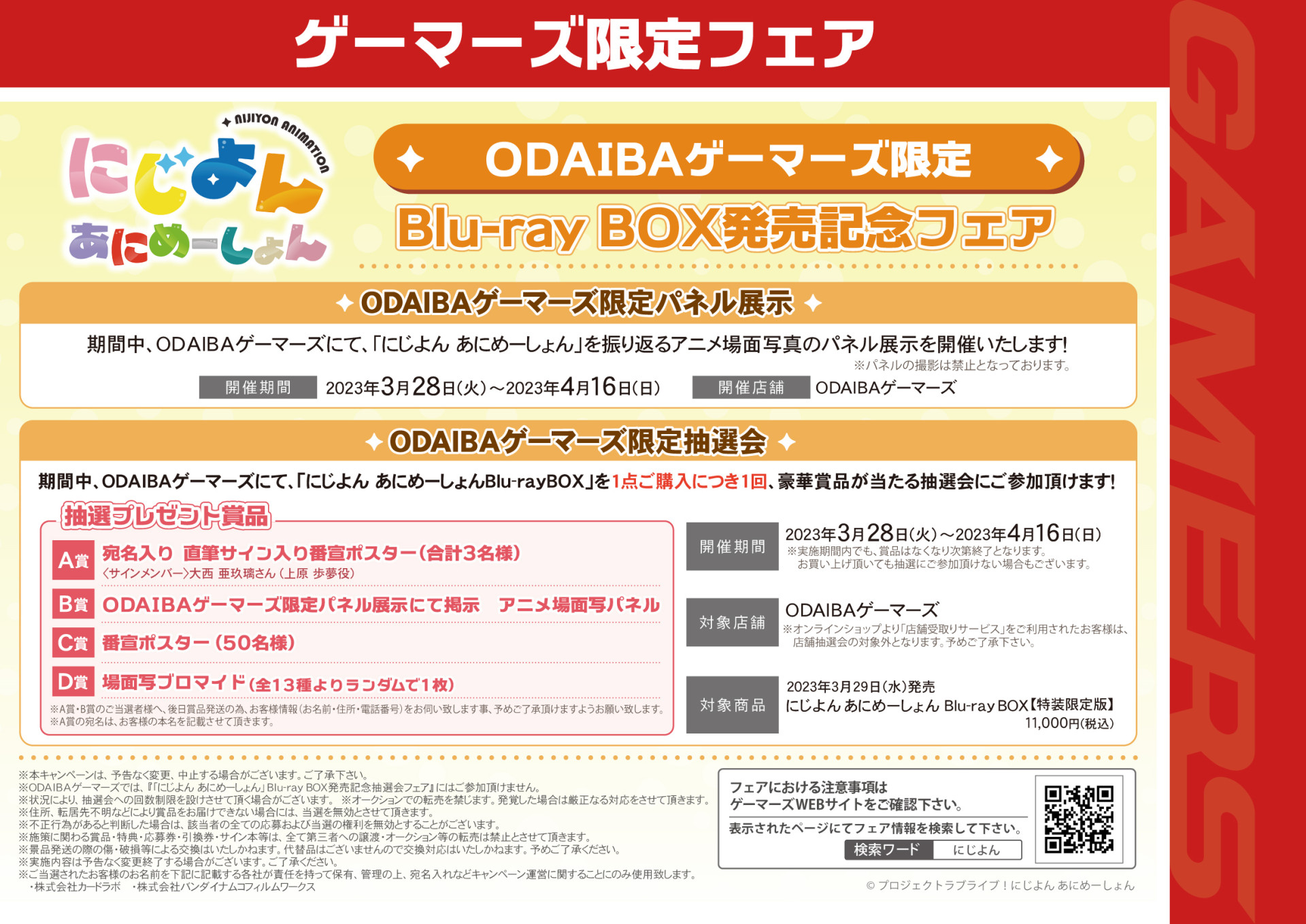 期間中、ODAIBAゲーマーズにて、「にじよん あにめーしょんBlu-rayBOX」を1点ご購入につき1回、豪華賞品が当たる抽選会にご参加頂けます!