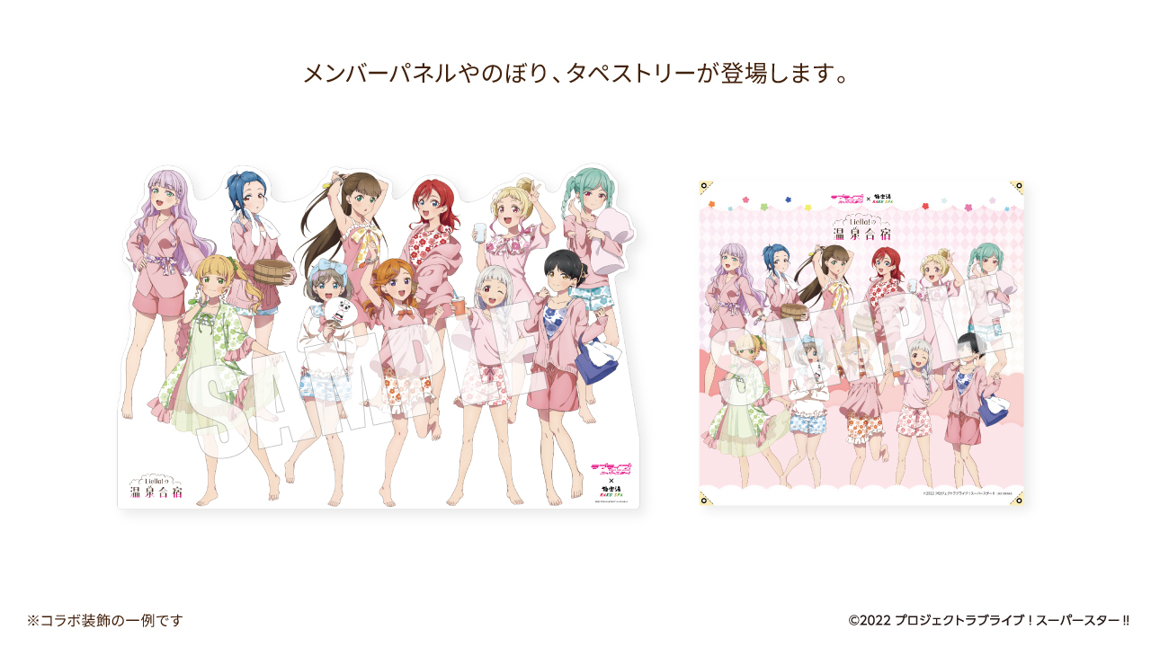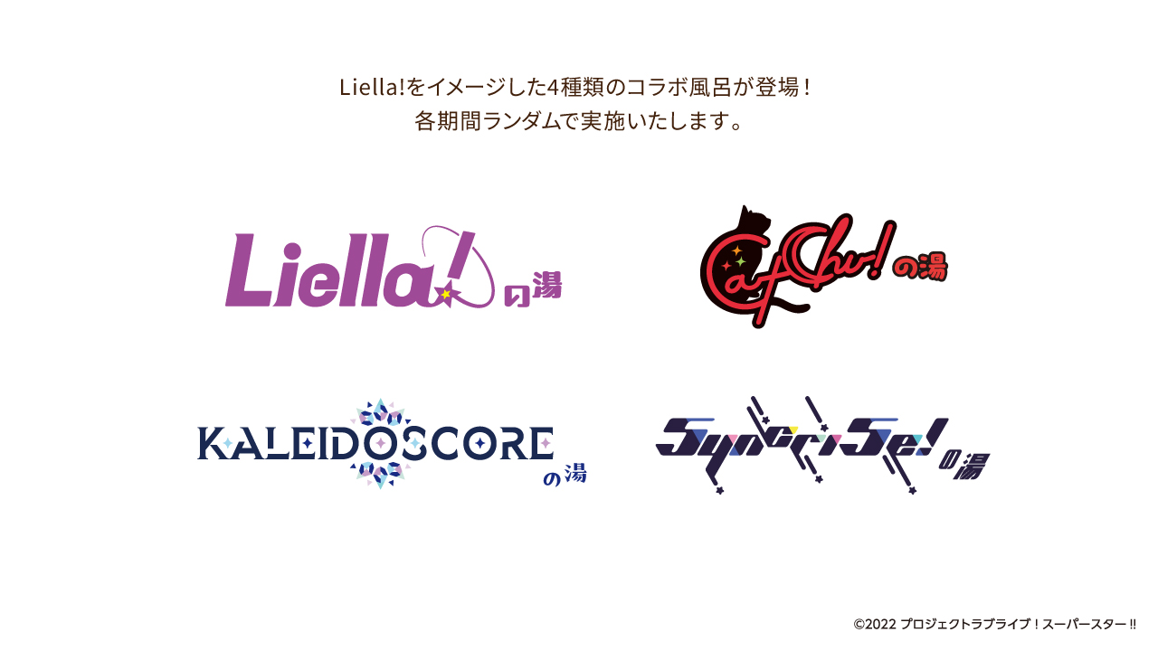 Liella!をイメージした4種類のコラボ風呂が登場し、浴室には特別にデザインしたタペストリーを装飾します。