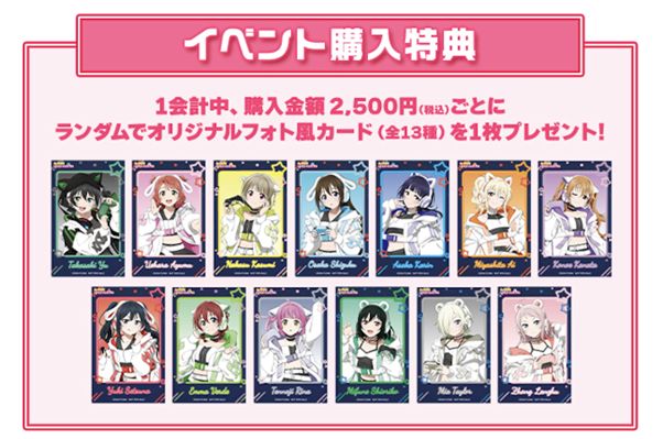 「ラブライブ!虹ヶ咲学園スクールアイドル×ラウンドワン コラボキャンペーン」グッズを税込2,500円お買い上げごとに、オリジナルフォト風カード(全13種)をランダムで1枚プレゼント!