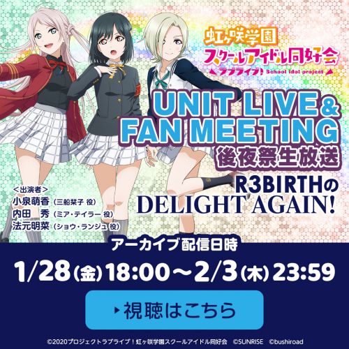 「ラブライブ!虹ヶ咲学園スクールアイドル同好会 UNIT LIVE & FAN MEETING後夜祭生放送 ~R3BIRTHのDELIGHT AGAIN~」アーカイブ配信決定!